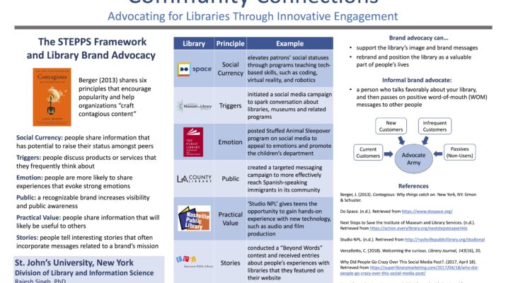 We live in an age of information overload. We can find answers to our questions within seconds, and we can download books straight to our devices. Why then, do we need libraries? Information professionals face the task of rebranding their institutions to create a space that the public wants and needs to experience. Consequently, they strive to cultivate connections with their communities by providing innovative library programs and events. This poster will provide insight on transforming a library’s image from a public service institution to a community hotspot by utilizing Berger’s STEPPS framework: Social Currency, Triggers, Emotion, Public, Practical Values, and Stories (Bergen, 2013). Symposium attendees will learn to revamp their library’s image in the community; appeal to the public through innovative programs and campaigns; and cultivate relationships to encourage valuable informal brand advocacy. (Reference: Berger, J. (2013). Contagious: Why things catch on. New York: Simon & Schuster.)