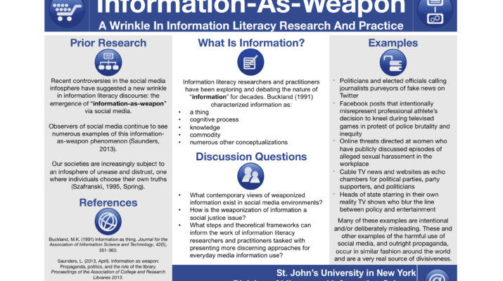 Information literacy researchers and practitioners have been exploring and debating the nature of “information” for decades. Information has been characterized as a “thing”, as a cognitive process, as “knowledge”, as a commodity, and numerous other conceptualizations. Recent controversies in the social media infosphere have suggested a new wrinkle in information literacy discourse—the emergence “information-as-weapon” via social media. Examples include politicians calling journalists purveyors of fake news, intentional misrepresentation of professional athletes’ decision to kneel during televised games in protest of police brutality and inequity, and threats directed at women who have publicly discussed episodes of alleged sexual harassment. We can assume many of these examples are intentional and/or deliberately misleading. These and other examples of the harmful use of social media (and outright propaganda) occur in similar fashion around the world and are a very real source of divisiveness. This objective of this poster is to present a contemporary view of weaponized information in social media environments and to argue that the weaponization of information is a social justice issue.